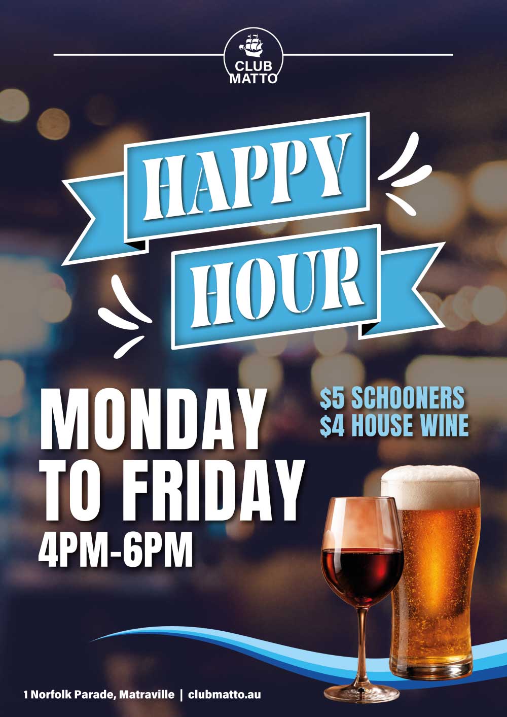 $5 SCHOONERS | $4 HOUSE WINE | $10 COCKTAILS (Sunday only) Monday – Friday @ 4pm-6pm Sat @ 1pm-6pm | Sun @ 5pm-7pm